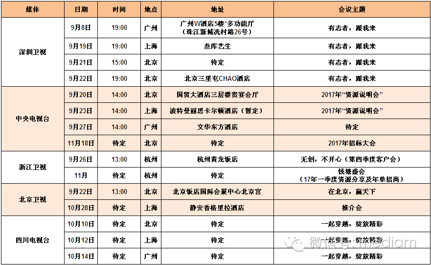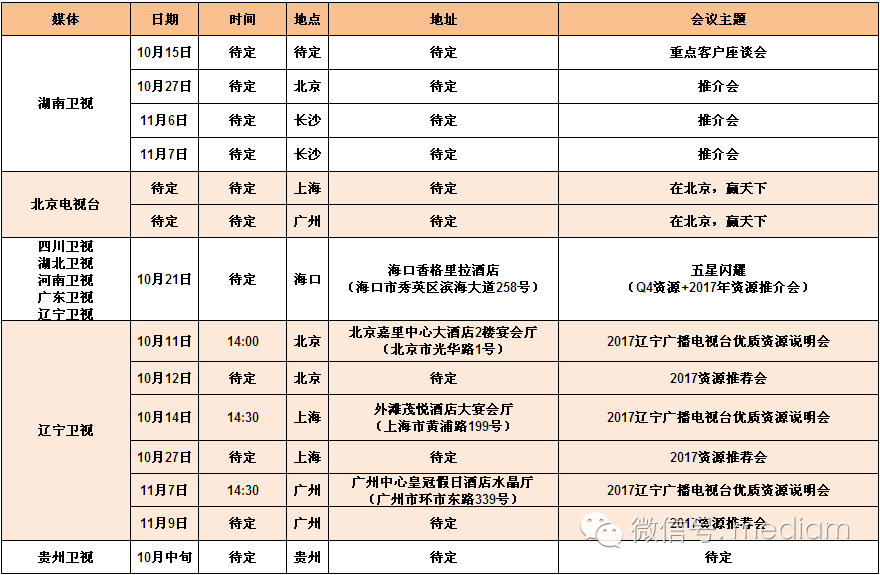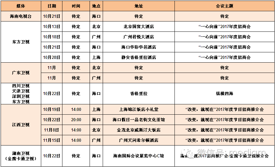 广告业已进入了火热的10月。各家媒体资源推介会进行的如火如荼,动量君整理了2017年各电视和视频媒体广告招标会时间表,以供各位跑会的亲们参考。