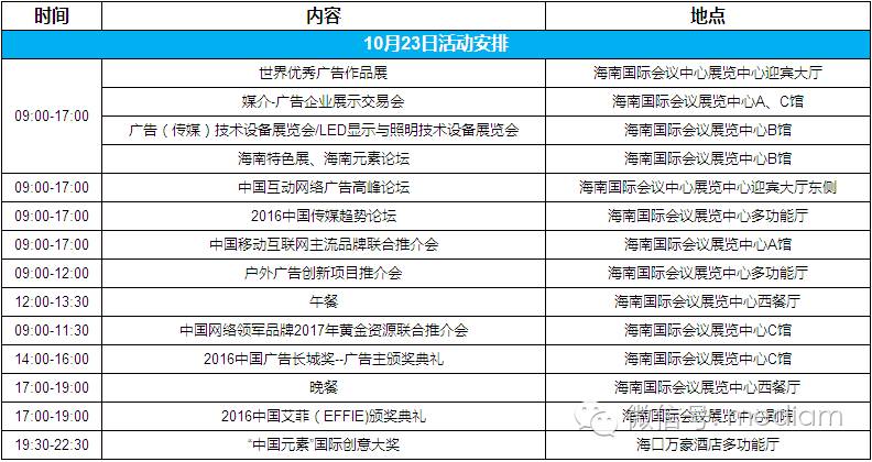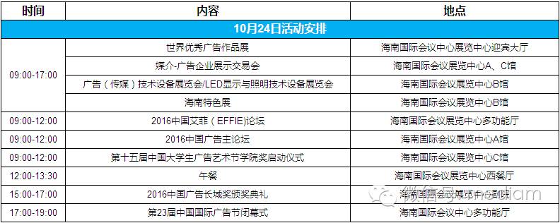 第23届广告节 中国广告界年度盛事——第23届中国国际广告节将于2016年10月21-24日在海口举行。届时来自世界各地主流媒体,知名广告公司、品牌广告主及相关专业人士都将齐聚海南国际会议展览中心,共商2017品牌传播大计,了解广告行业最新趋势。在这个高效、专业、开阔的平台上,可要把握时机哦!
