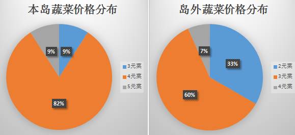 本岛蔬菜:1种蔬菜在2-3元/斤,9种蔬菜在3-4元/斤,1种蔬菜在4-5元/斤,0种蔬菜在5-6元/斤, 0种蔬菜品种在6-7元/斤,菜价主要集中在3-4元/斤间。