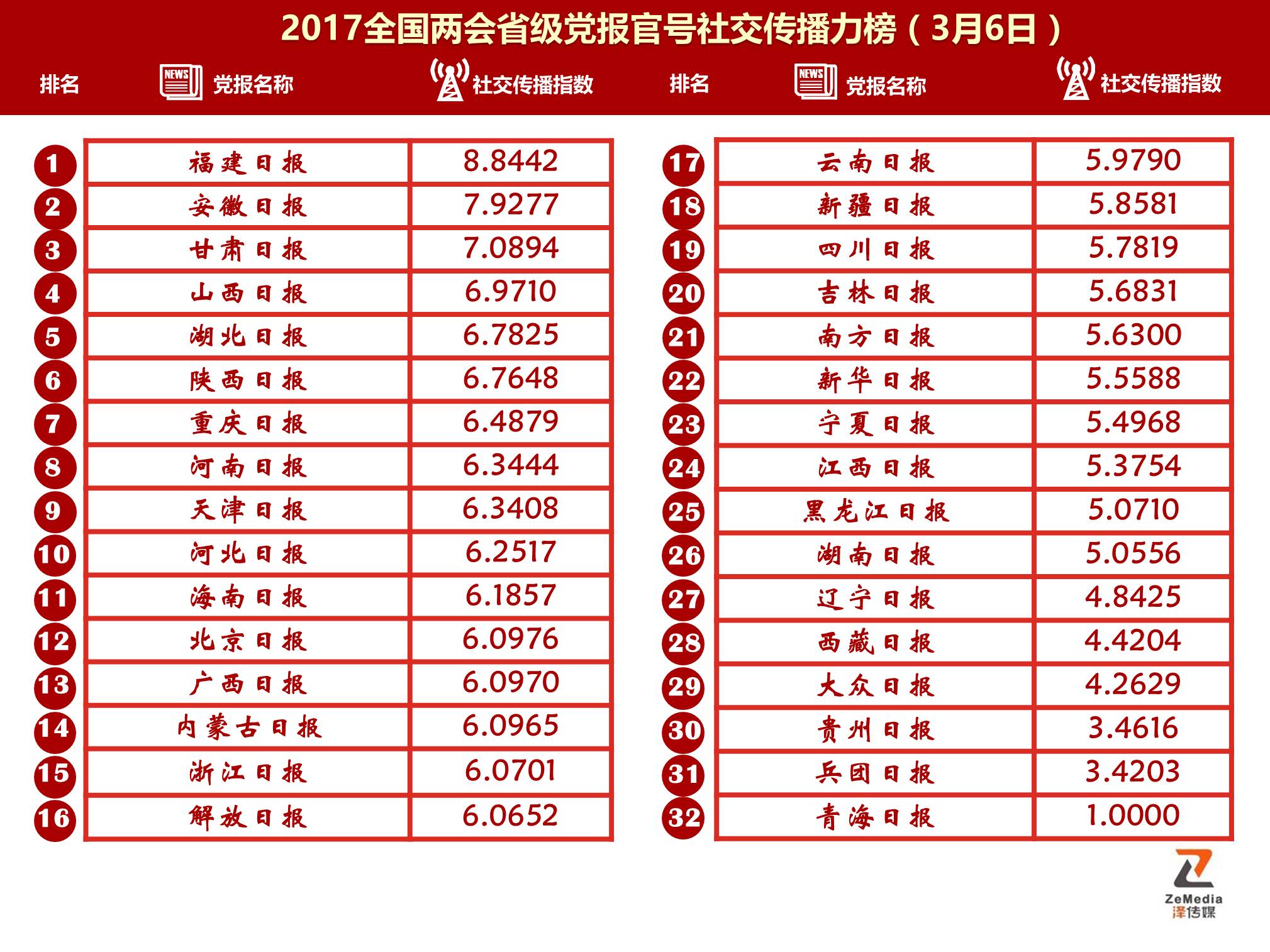 3月6日,在各分项指标中,省级党报官方微信微博指数排名前五的省级党报分别为《四川日报》《海南日报》《江西日报》《河北日报》《天津日报》《北京日报》(后两者并列第五),其中,泽传媒微博指数ZBI突破400的包含《四川日报》《北京日报》《广西日报》《天津日报》,泽传媒微信指数ZCI突破400的包含《南方日报》《河北日报》《海南日报》;《福建日报》《安徽日报》《甘肃日报》《陕西日报》《湖北日报》(后四项并列第二);《福建日报》《安徽日报》《甘肃日报》《陕西日报》《山西日报》;习式热词指数《福建日报》《安徽日报》《甘肃日报》《山西日报》《新疆日报》五家省级党报并列第一。