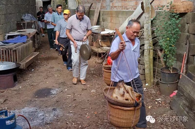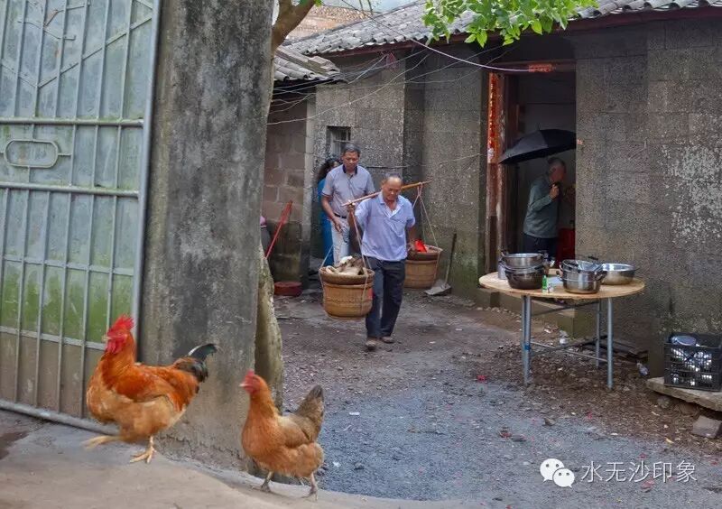 15、吉时已到,由一位长辈挑着“有头有尾”和装有米和毛巾的箩筐最后出门。