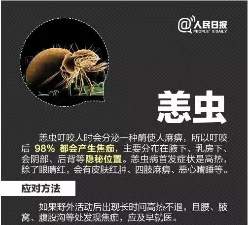 恙虫喜欢叮咬人的潮湿部位,如腋窝、腹股沟等隐蔽部位。在被叮咬后会形成一个焦痂,。而发热、。随着病情进展,病人还会出现皮肤充血,甚至出血,严重时会导致多脏器器官衰竭,甚至导致死亡。