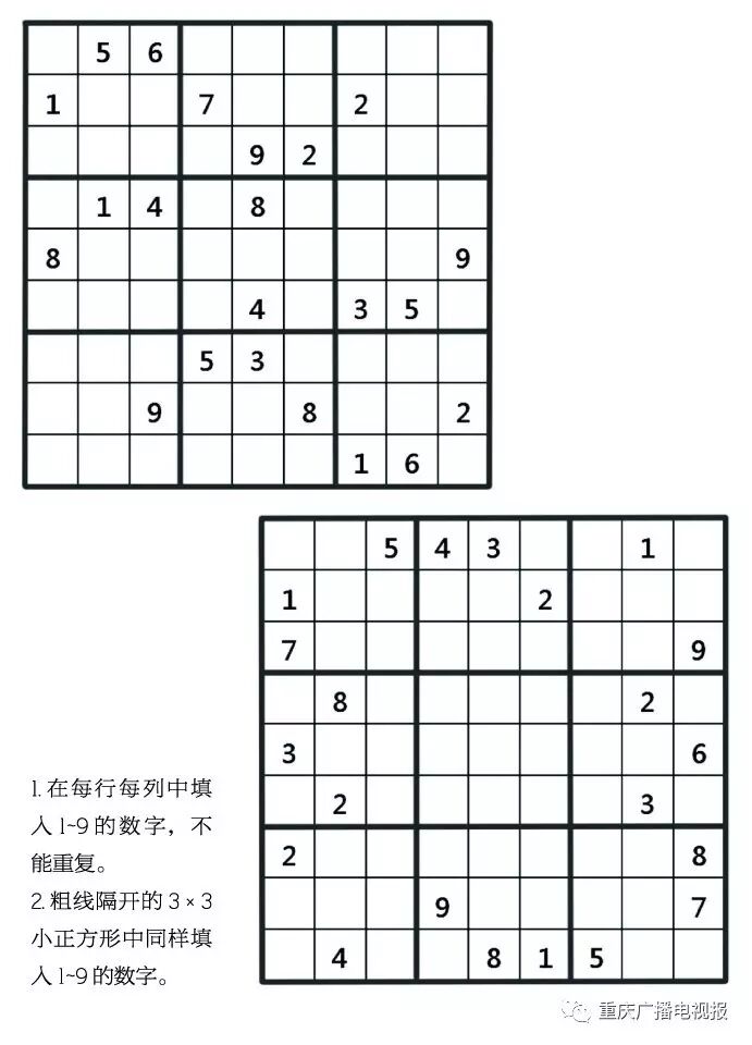 2.粗线隔开的3×3小正方形中同样填入1~9的数字。