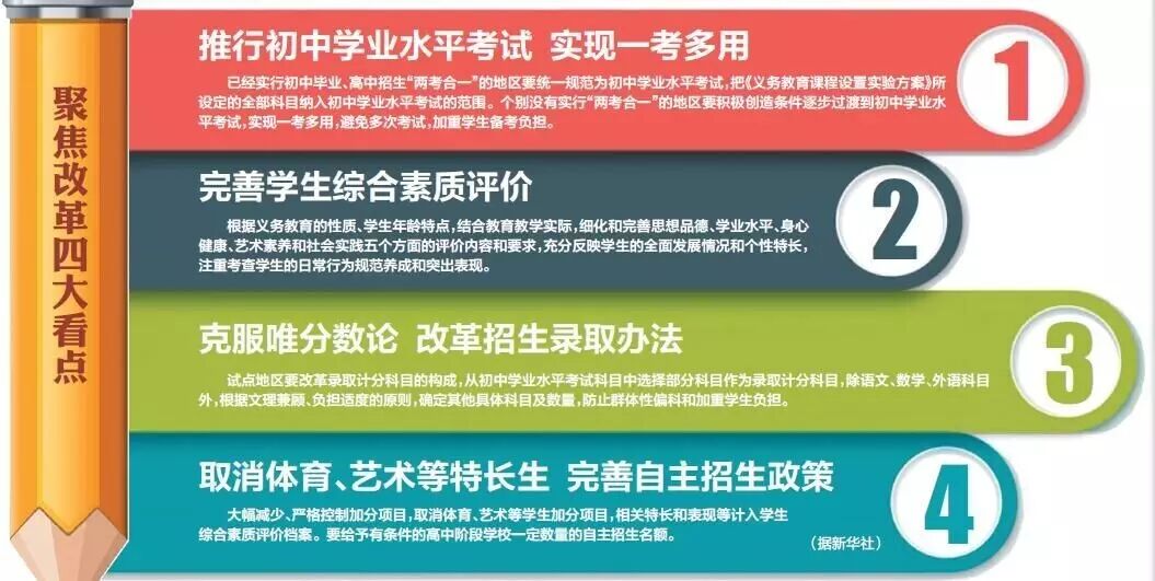 最新改革方向:为防止增加学生负担,这次改革进行了综合设计。在考试内容上强调提高命题质量,减少单纯记忆、机械训练性质的内容;在成绩呈现方式上,提出可以采用分数、等级等多种形式呈现,鼓励有条件的地区实行“等级”呈现,克服分分计较;在录取计分科目的构成和数量上,要求在语文、数学、外语3科以及体育科目之外做到文理兼顾、负担适度,不是把所有的考试科目都纳入录取计分总成绩,没有纳入总成绩的科目考试成绩合格即可。同时提出,各地可针对不同学科的性质和特点,确定具体的考试方式和方法。
