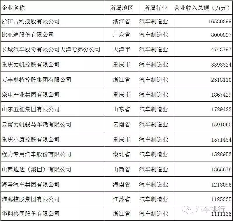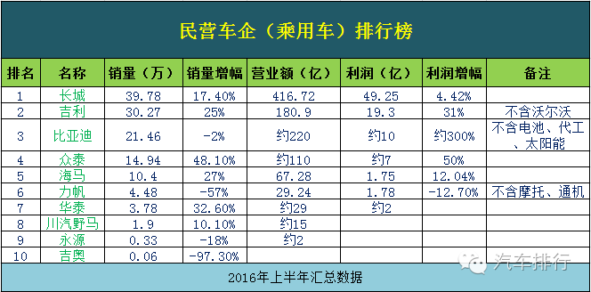 上表当中有8家根本不是乘用车主机厂,像万丰奥威、华翔之类的都是生产汽配件的。而且表格中的营业额部分,吉利含了沃尔沃,比亚迪含了电池、代工和太阳能板块,力帆含了摩托、通机等板块,不是单纯的汽车销售额。笔者搜罗资料,汇总了属于民营企业的汽车主机厂排行,仅供参考。
