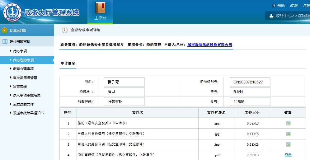 近日,海口海事局通过网上政务审批系统顺利完成了“棋子湾”轮《最低安全配员证书》的换发审批,正式启动海口海事局 “互联网+船舶登记”的便民服务新模式。