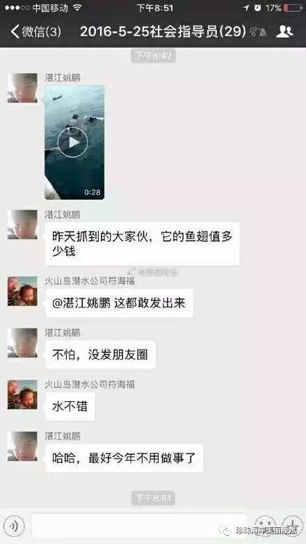 网传视频由网友“湛江姚鹏”在3月8日在微信群里发布。视频时长28秒,主要内容为3名潜水员在海域中对一条疑似鲸鲨的鲨鱼进行观察、抚摸、捕抓等。网络传出的微信群聊截图显示,“湛江姚鹏”称“三个人一起抓的”,“抓到了都是钱啊”。10日下午姚鹏接受媒体采访时称,事发当时他并不在现场,发布这段视频只是“想跟大家开玩笑”。姚鹏称,视频是其朋友称在海南分界洲岛放生鲸鲨的画面。