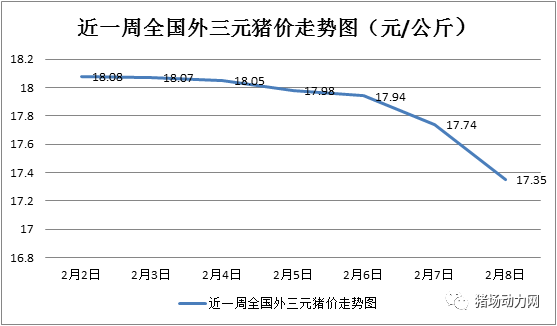 据猪场动力网“动力猪价”统计,今日全国外三元生猪均价较昨日出现大幅度下跌,全国生猪平均价格为17.35元/公斤,较昨日猪价下跌0.39元/公斤。