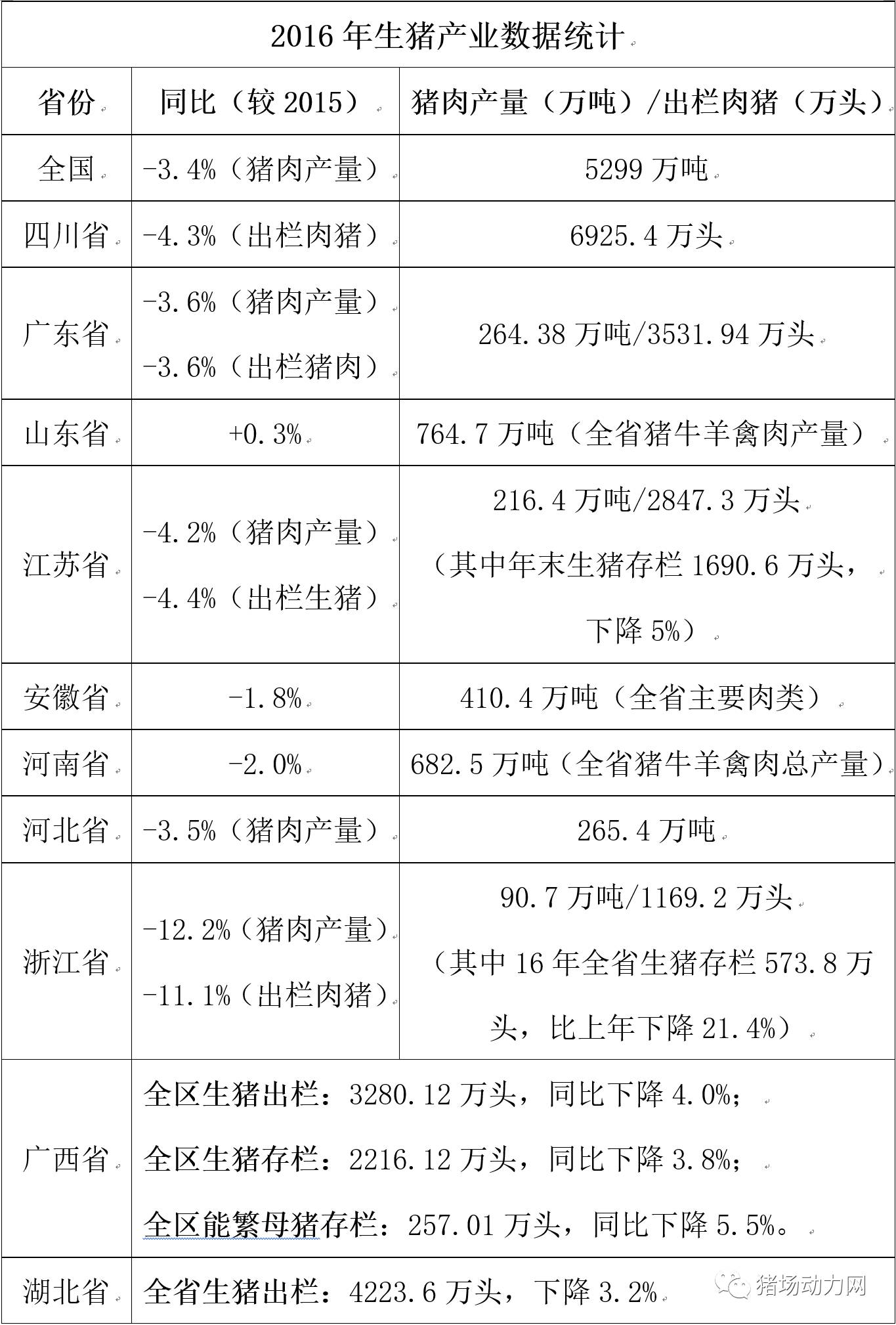 二、当前市场上相对于往年而言,猪不多。从具体数据来看如下图,猪肉产量就呈现急剧下降的趋势,共计减少372万吨,以下为16年全国生猪产业各省(不完全)的具体数据: