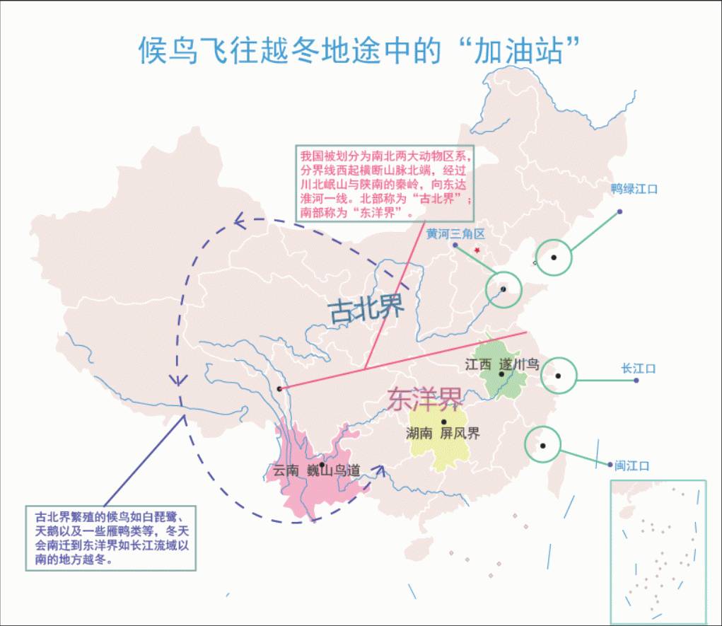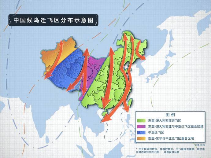 我国作为一个幅员辽阔的国家,南北纬度跨度近50度,东西经度跨度超过60度,每年都会有很多候鸟从南北方上空飞过。在全球候鸟迁徙路线中,有三条经过了我国,并将我国划分为四大迁飞区: