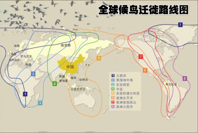全球候鸟迁徙一共有8条路线,路程远,范围广,几乎覆盖了各个大洲。