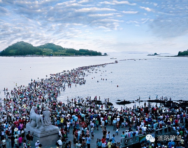 韩国全罗南道珍岛古郡面回洞里和义新面茅岛里之间,海水退潮时会出现一条长达2.8公里、宽40-60米的海底陆路,将大海一分为二,那长长的人群在大海中凌波微步,如电影里的场面一样新奇壮观。大约1个小时左右,海路渐渐消失直至恢复原状。这里很像《旧约》中摩西的故事,所以被称为摩西的奇迹。神秘海路出现的地方平时水深5-6米,这里海水每年分开2次,第一次发生于4月至5月初,第二次发生于7月中旬。为了观看这一大自然的奇迹,每年都有几十万国内外游客汇聚到这里,是世界上为观看一时的现象而聚集游客最多的地方。
