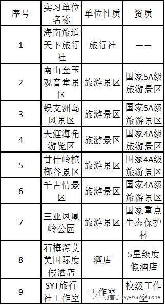 本专业已经在海南各市县的特色旅行社和景区建立了实习就业基地,形成了覆盖全省的实习就业网络,可以为学生量身定制省内各市县实习与就业单位。表1是旅行社管理专业目前的实习单位,今后本专业将继续与更多的单位建立合作关系。