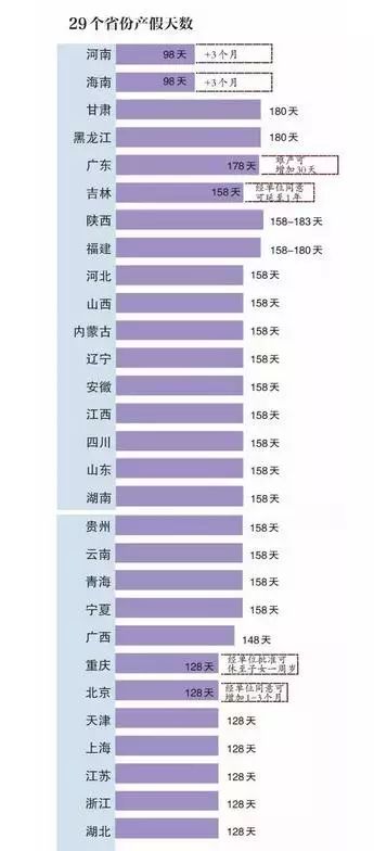 北京、天津、上海、重庆、江苏、浙江、湖北等7省份的产假为128天,即98天+30天。