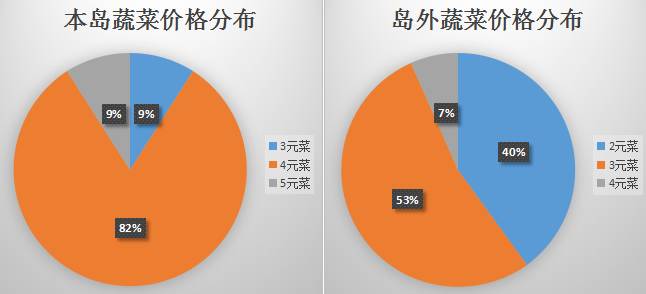 本岛蔬菜:1种蔬菜在2-3元/斤,9种蔬菜在3-4元/斤,1种蔬菜在4-5元/斤,0种蔬菜在5-6元/斤, 0种蔬菜品种在6-7元/斤,菜价主要集中在3-4元/斤间。