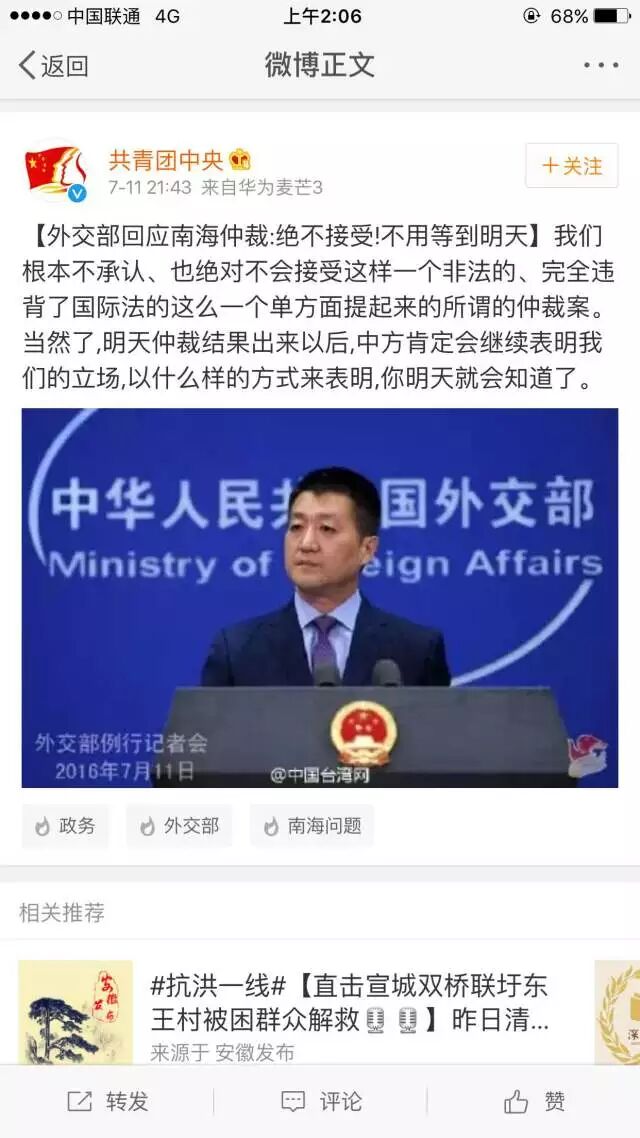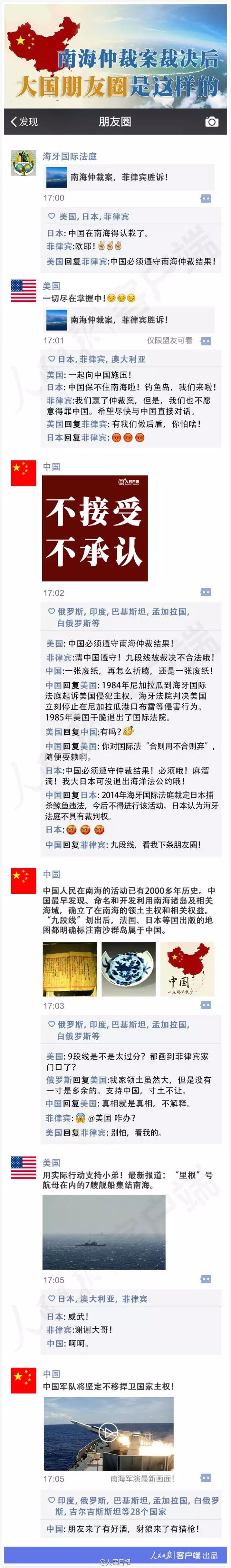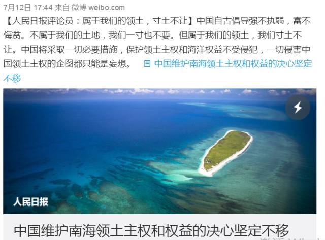 2016年7月12日,是中国最为艰难选择的一天。案即将宣布,美国两艘航空母舰已布署到南海。美国人就要以庭仲裁结果侵犯中国领海领空。昨天海南高速封路,DF21前往三沙市。下午五点结果出炉,但不管结果怎样,我们的态度都是: