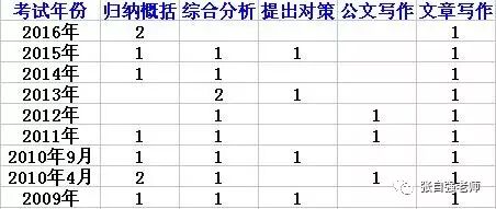近9年中,申论考试常规五大题型都有涉及,新题型几乎没有出现(此处注意区别国考题型),文章写作模块是唯一一道必考题型,归纳概括题型共出现9次,比例达26.5%;综合分析题型同样出现9次,比例达26.5%;提出对策题型出现4次,比例达11.8%;公文写作题型出现3次,比例达8.2%。按照上述数据可以从理论上得出归纳概括和综合分析两个小模块考试出现概率仅次于文章写作,但是同样提醒考生注意提出对策与公文写作两个模块,若考试题量为3道题时,二者出现概率极大,而且分值将会达到30分,此处在备考中务必引起注意。
