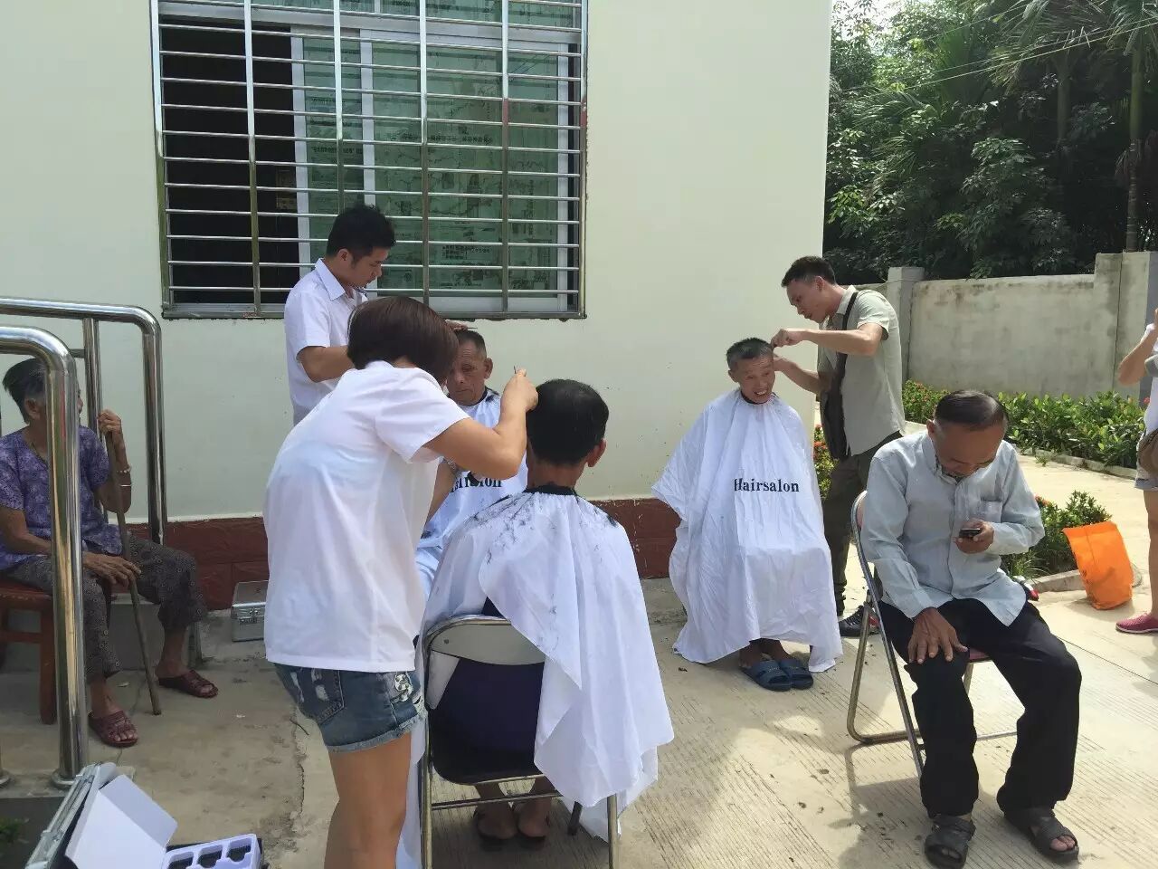 花仙子美容美发艺术学校的学生们正在给爷爷们理发。
