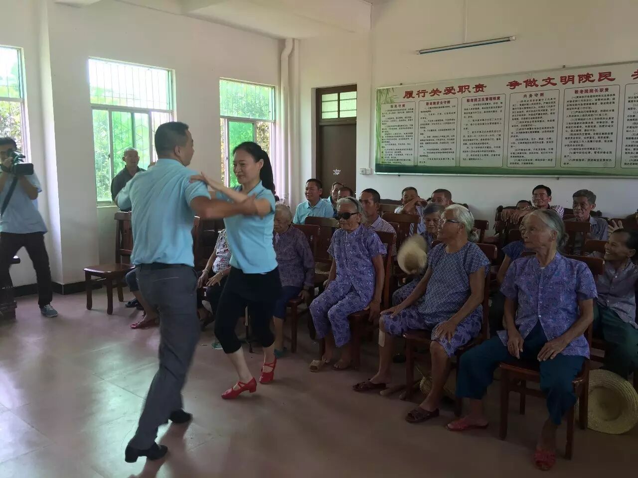 在现场,除了给老人发放日用品外,爱心志愿者们还给老人们带去了精彩的节目。