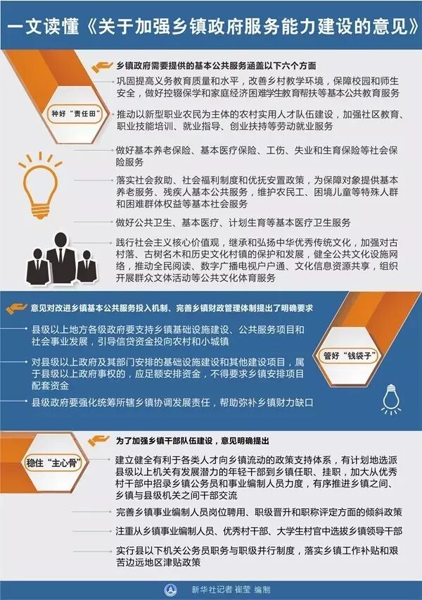 文件明确,乡镇政府要“着力强化公共服务职能”,并明确了教育、就业、养老、医疗和文化等方面服务职能。