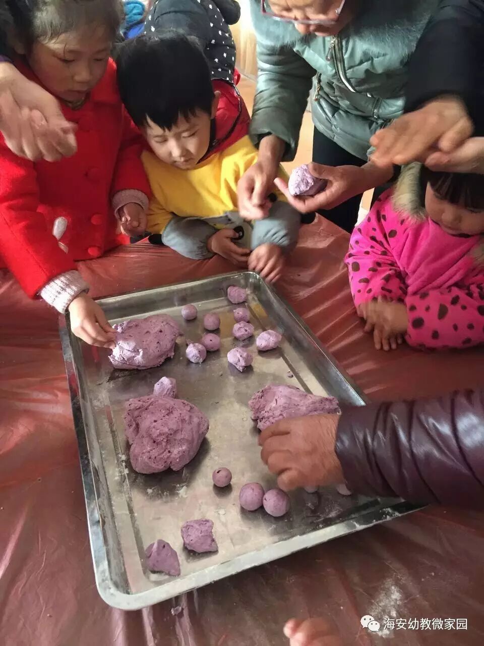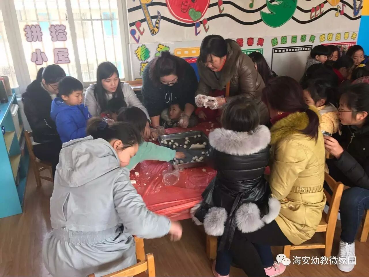 小2班的宝宝们已经迫不及待地地抓起了小面团,小手熟练地搓着汤圆,还一边跟老师说着: “老师,老师,你看我搓的圆不圆?”“哈哈哈!……”大家做得不亦乐乎。