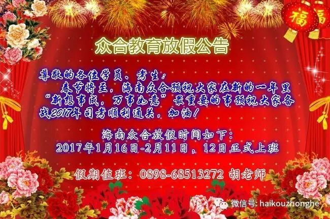 为了欢庆春节假期我校 (海南众合)定于2017年1月16日-2月11日放假,2月12日正式上班,假期期间我校值班电话: