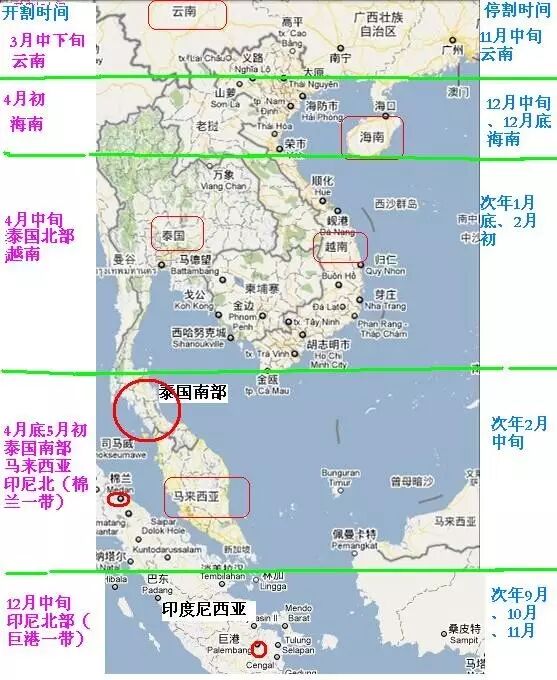 东南亚地区,4月中旬越南、泰国北部地区陆续进入开割,到4月底5月初泰国南部地区、马来半岛、印尼的赤道以北地区,主要是棉兰一带陆续开割。南半球的印尼巨港地区在当年的12月中旬便开始陆续开割了。