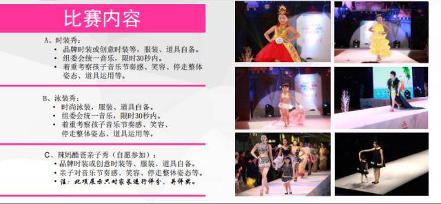 比赛方式:时装展示+泳装展示+亲子秀(此环节自愿参加)