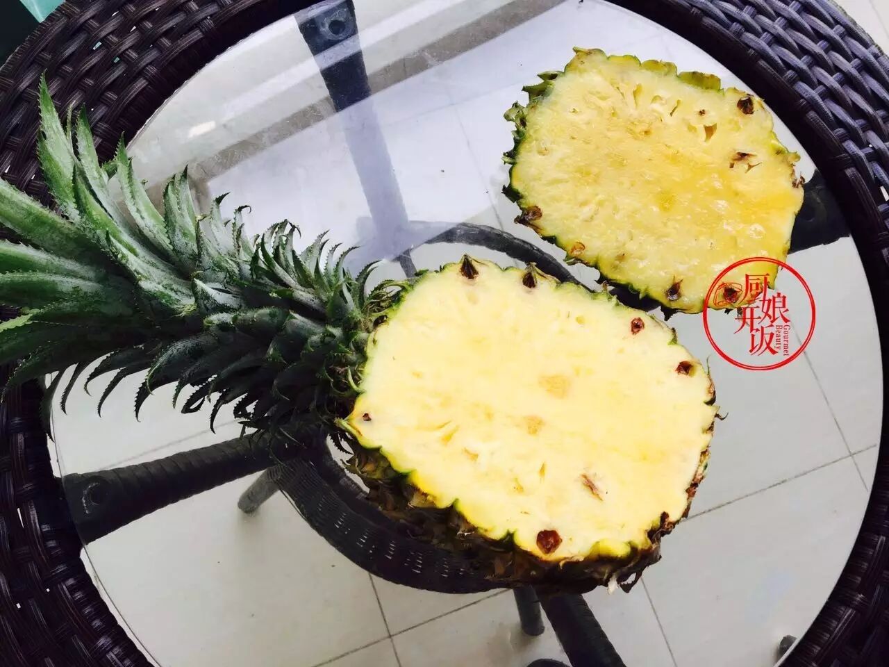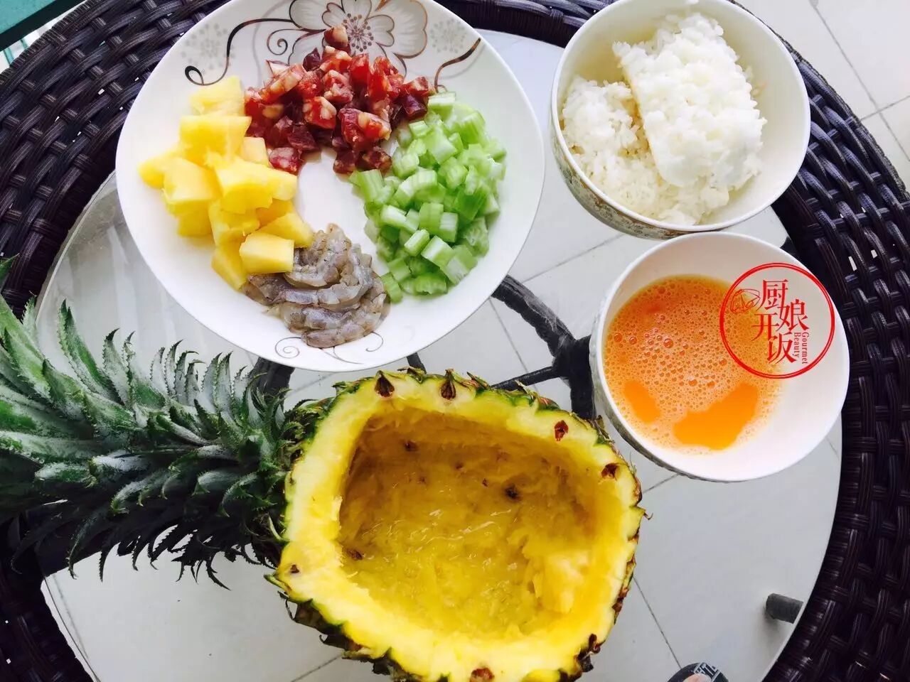 炒好的菠萝饭盛入挖空的菠萝内开吃(多出的菠萝可以榨汁下午茶)。