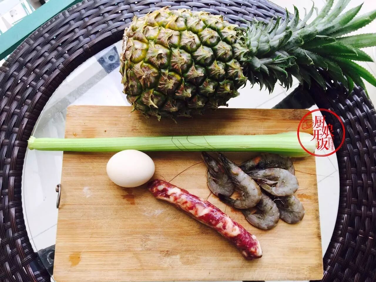 锅内油热放蒜片炒香,放剩米饭炒散;倒入鸡蛋液,将蛋液炒到包裹每粒米饭粒;再依次放入腊肠、西芹、虾仁翻炒,加少许盐、白胡椒调味,最后倒入菠萝丁翻炒两下出锅(菠萝不能长时间炒会出水影响米饭口感)。