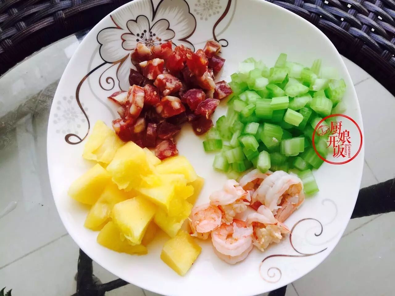 腊肠蒸熟(个人觉得腊肠炒了会有点干),将西芹焯水(水里放少许油、盐可让蔬菜颜色鲜艳),虾仁焯水变色马上捞出(水中倒少许料酒,时间大概也就十几秒种)。