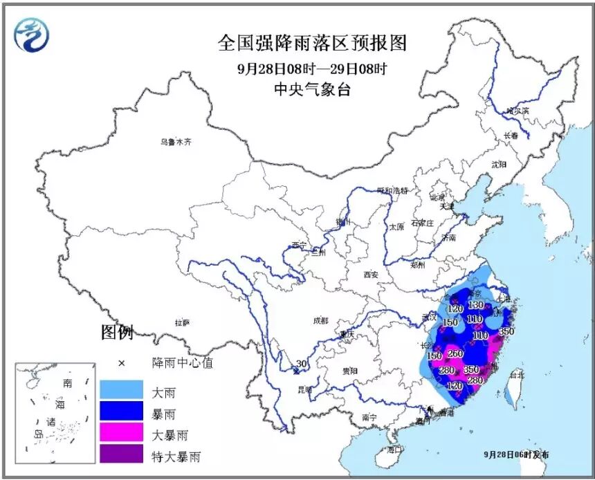 继续发布暴雨橙色预警: 预计,9月28日08时至29日08时,福建、浙江、江西、广东东部、苏皖中南部等地有大雨或暴雨! 其中,福建东部和南部、广东东北部、浙江东南部和西部、江西东南部和西部、安徽西南部等地的部分地区有大暴雨! 福建南部、浙江东南部和江西中部偏南地区局地有特大暴雨(250~350毫米),上述部分地区并伴有短时强降水,最大小时雨强可达80~120毫米!