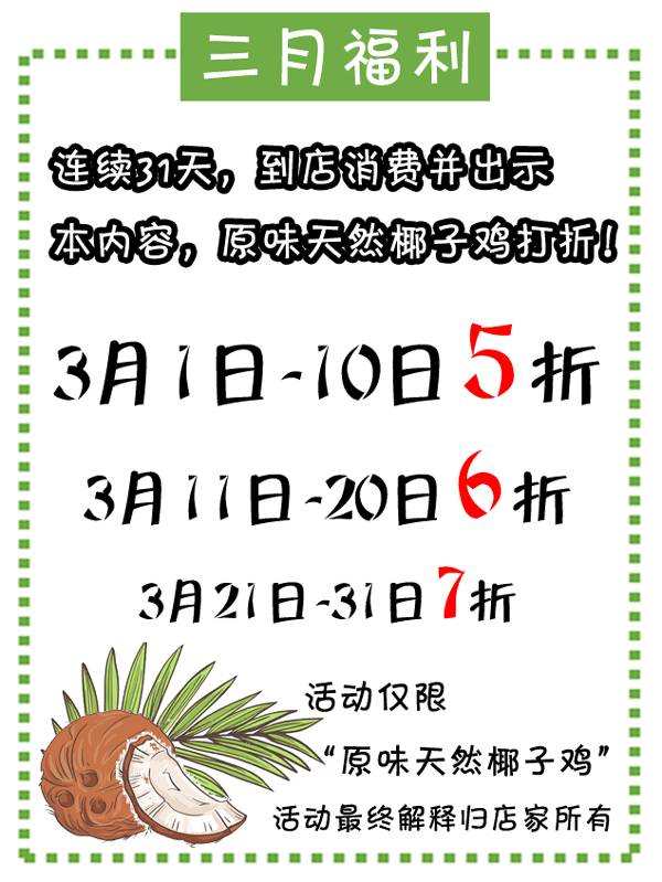 新一年才刚刚开始,他就出来搞事。很少打折的他,这次花了重本,连续十天“原味天然椰子鸡”5折。平时点一只椰子鸡都要100多大洋,现在一张还有得找!