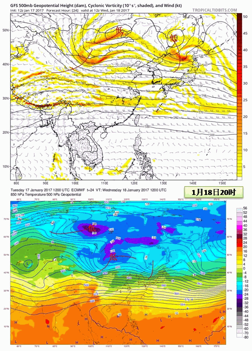18日08时,500hpa东亚大槽较为宽广,冷空气分为两股,一股位于东北南部-黄海,即将移出我国,另一股是位于蒙古国境内的横槽。850hpa长江流域上空受一横向切变线影响。南支槽仍然维持,但较为浅薄,我国中低纬度上空处于平直西风气流之下。