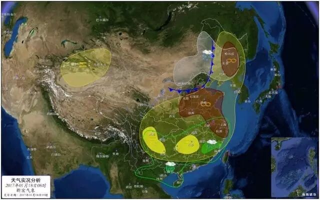 17日08时-18日08时,华北北部、内蒙古中东部、东北中南部有小到中雪;西南东部、长江流域及其以南地区有小到中雨。东北东南部、华北南部、江淮东部等地出现轻到中度霾。