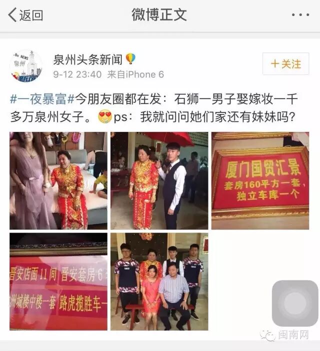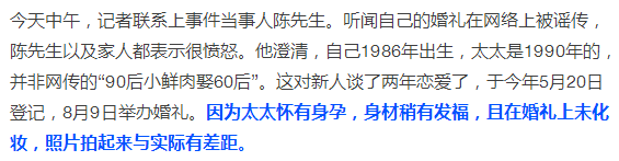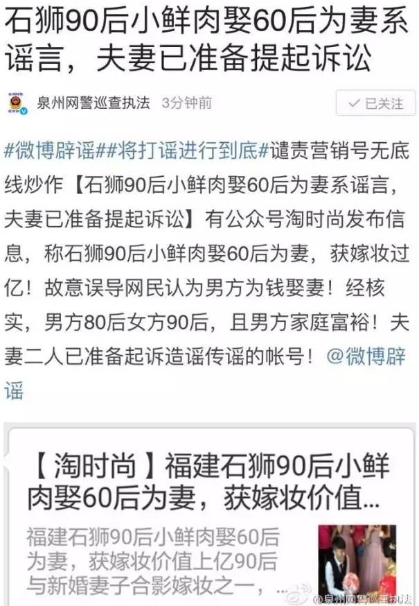 @泉州网警巡逻执法:#微博辟谣# #将打谣进行到底# 谴责营销号无底线炒作【石狮90后小鲜肉娶60后为妻系谣言,夫妻已准备提起诉讼】有公众号淘时尚发布信息,称石狮90后小鲜肉娶60后为妻,获嫁妆过亿!故意误导网民认为男方为钱娶妻!经核实,男方80后女方90后,且男方家庭富裕!夫妻二人已准备起诉造谣传谣的帐号!