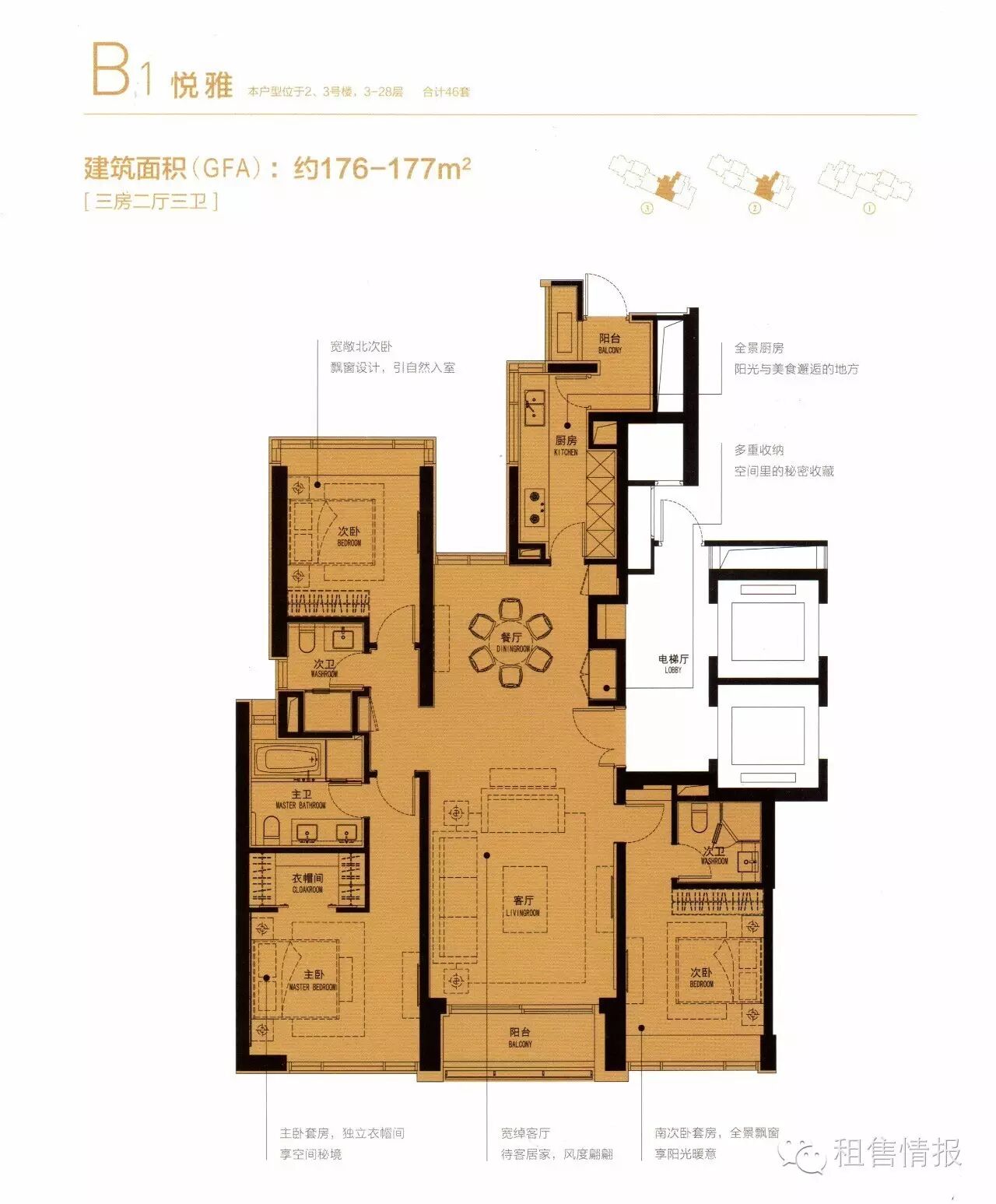 建筑面积约176-177㎡,位于2、3号楼3-28层,共计46套