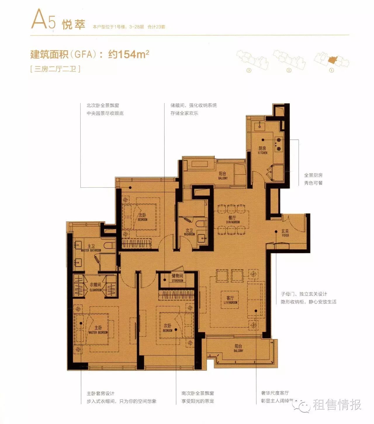 建筑面积约154㎡,位于1号楼3-28层,共计23套