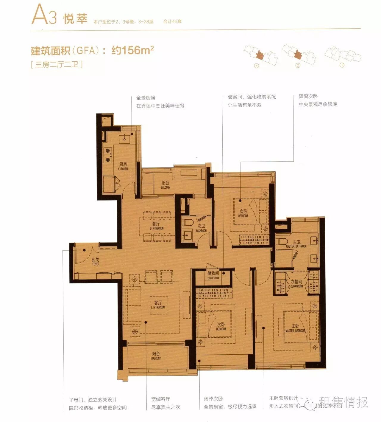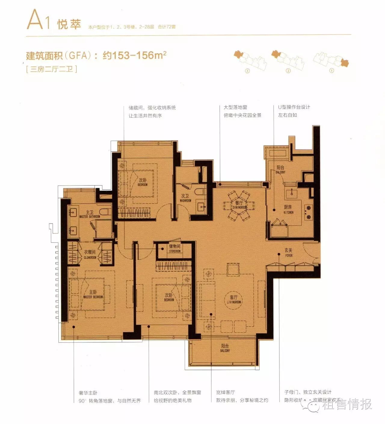 A1户型(悦萃),建筑面积约153-156㎡,三房两厅两卫。本户型位于1号楼西边套、2号楼西边套、3号楼号楼右边套,2-28层,共计72套。