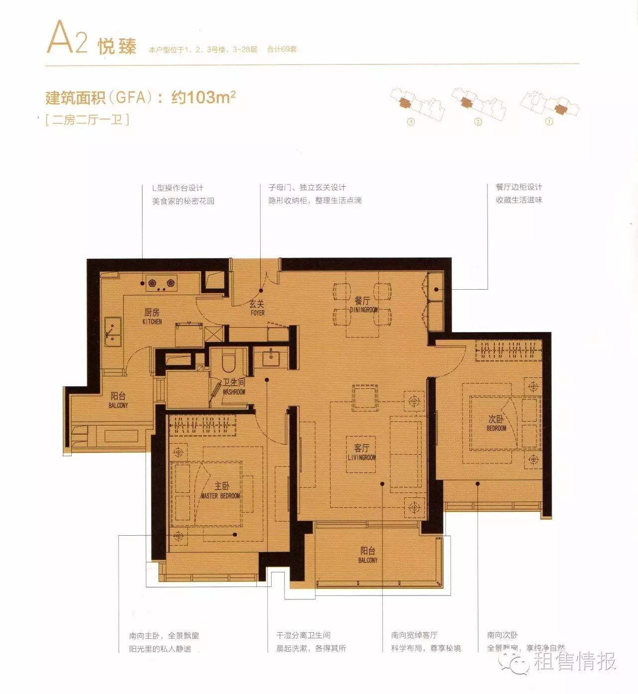 建筑面积约103㎡,位于1、2、3号楼3-28层,共计69套