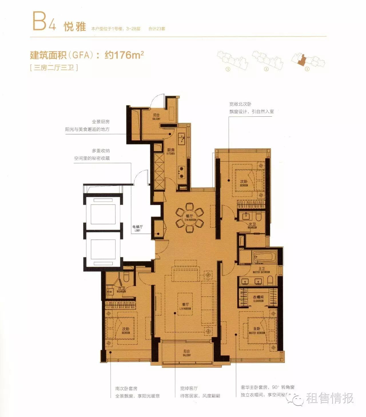 建筑面积约176㎡,位于1号楼3-28层,共计23套