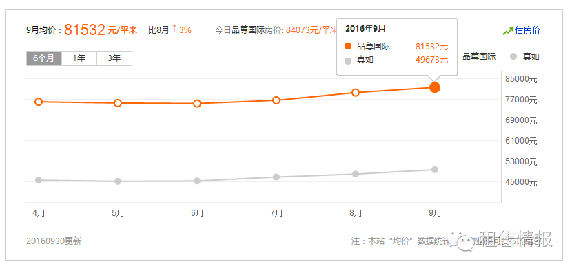 我们再来看看其他的城市副中心,以真如为例,9月份二手房均价 49673 元/m²,区域标杆楼盘品尊国际,二手房均价81532 元/m²。