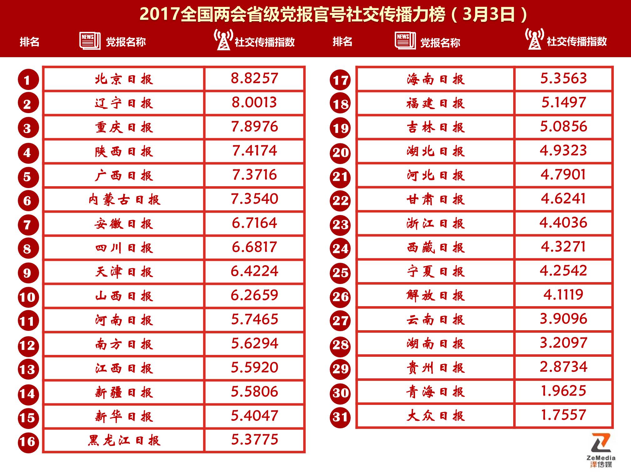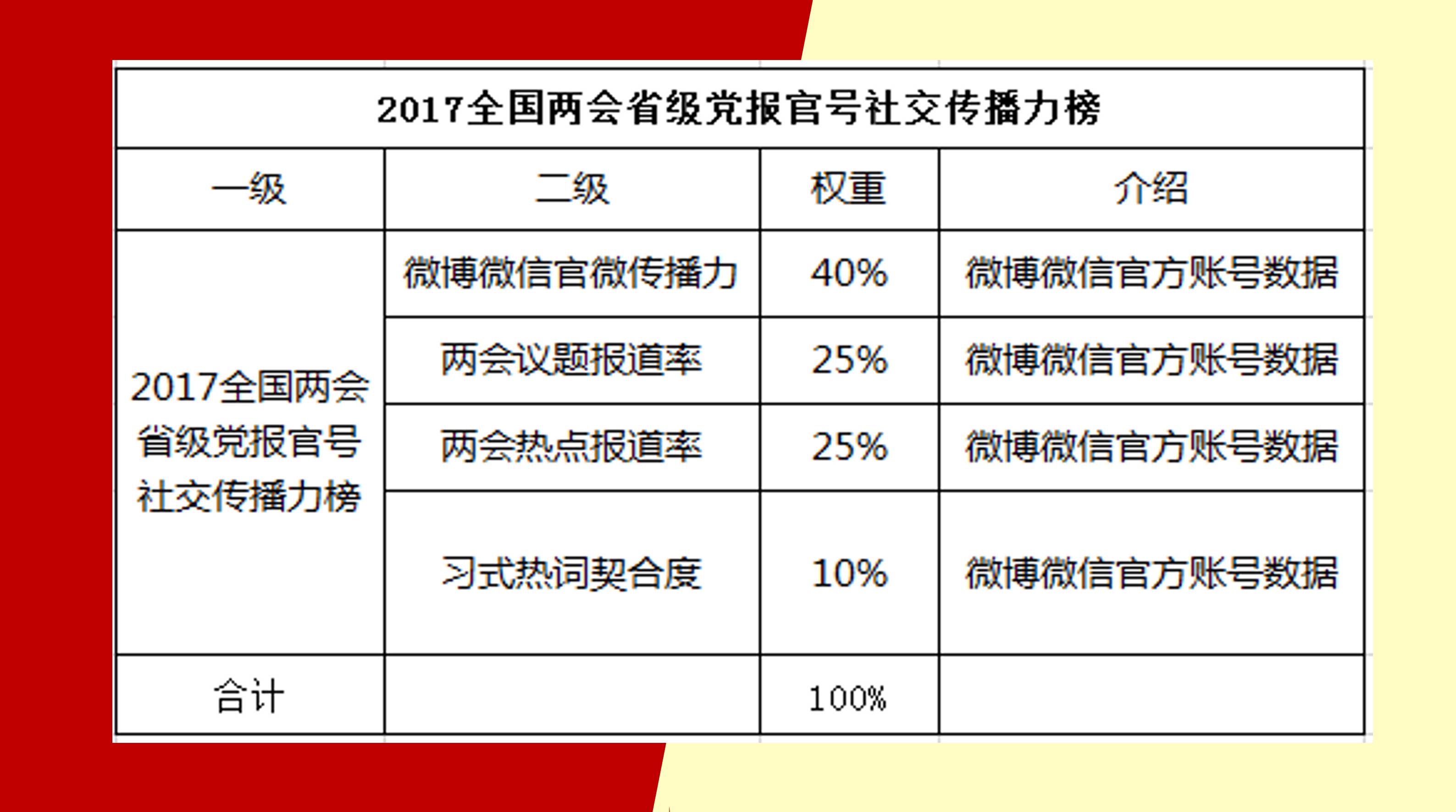 ,具体考核指标由省级党报官方微信微博指数、、、习式热词指数构成,旨在客观呈现省级党报官方微信微博账号的影响力与传播力。榜单由国内传媒行业大数据监测与专业研究机构——泽传媒推出,。除全国省级党报社交传播榜外,,泽传媒携手人民网还将陆续发布客观反映全国省级电视全网传播融合力、省级广播社交传播力的相关榜单。