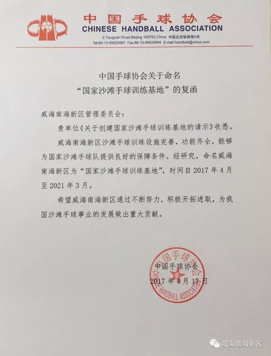 威海南海新区国际沙滩运动基地设施完善,功能齐全,能够为国家沙滩手球队提供良好的保障条件,因此被中国手球协会命名为“国家沙滩手球训练基地”。此次获批不仅对于支持国家沙滩手球队训练、承办沙滩手球赛事、促进集中训练和区域交流及推广沙滩类运动具有重要意义,而且将带动威海南海新区体育为核心的相关配套产业发展,促进威海南海新区经济、生态、社会效益健康发展。
