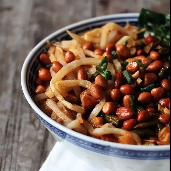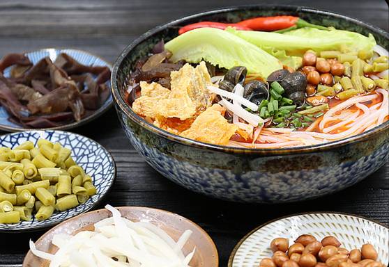 一份螺蛳粉的标配:粉就不用说了,最重要的就是作为灵魂的酸笋。酸笋的发酵气味直接奠定了一碗螺蛳粉的“上层气息”,爱的人是真爱,吃不来的就不是什么美妙滋味了。接着是酸菜,每家放的不尽相同,比如酸豆角、酸萝卜....不可不说的就是炸腐竹,腐竹炸的好可为螺蛳粉直接加起码20的印象分,干吃酥脆喷香蘸汤油韧入味儿即为佳品。剩下的有作为点睛之物的炸花生、脆爽的木耳以及青菜。