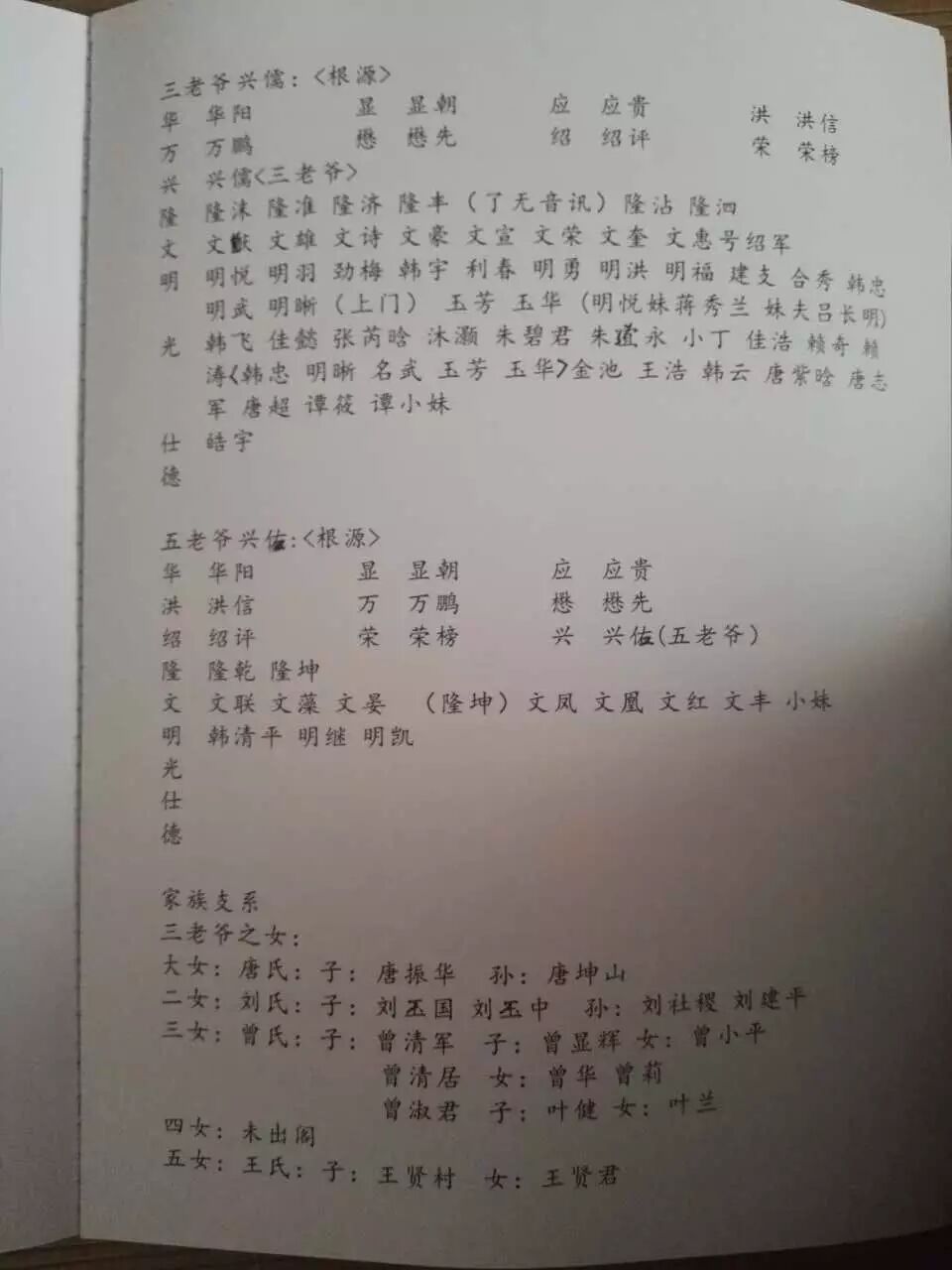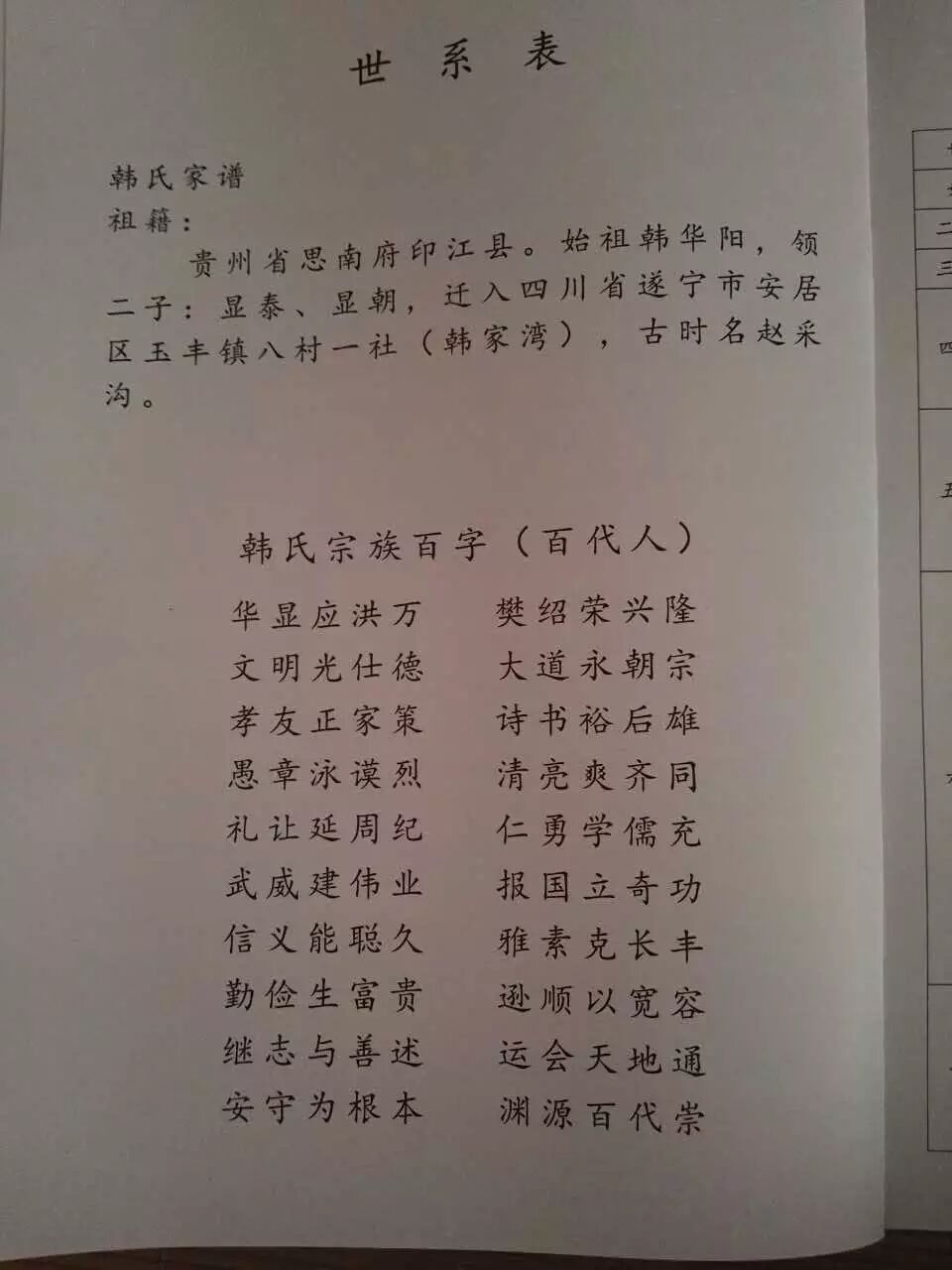 附:重庆黔江韩氏共四个韩氏支系,本脉支系在黔江人口最多,分布最广.其中重庆:黔江区黄溪镇韩氏字辈是《语文成玉志,光宗啟太昌,体现前元永,恒开是再长》