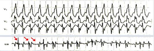 右束支阻滞型宽QRS波心动过速,体表导联未见P波,食管导联清晰显示P波,RP¯呈3:2逆行传导,提示室速伴室-房3:2逆行传导。