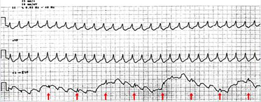 宽QRS波心动过速。体表心电图无法识别有否P波,而食管心电图可清晰显示P波,且呈现为房室分离,提示本例宽QRS波心动过速为室速。