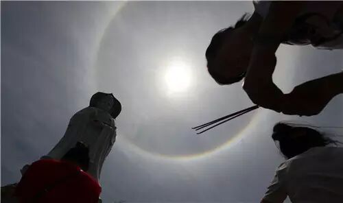 人群中不时有人手拿单反相机,将这和谐、使人难忘的时光记录下来,留作永久的纪念。菩萨慈悯,天工作美,天空突然出现了难得一见的日晕奇景。