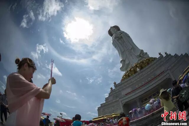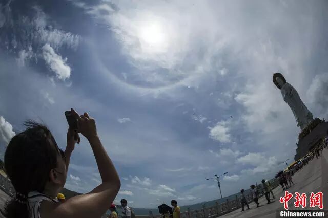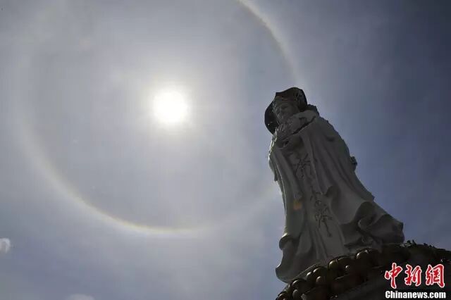 2013年4月29日,海南三亚上空出现罕见的日晕奇观,在三亚南山景区108米海上观音像前,不少游客驻足观看这一奇景。中新社发 骆云飞 摄